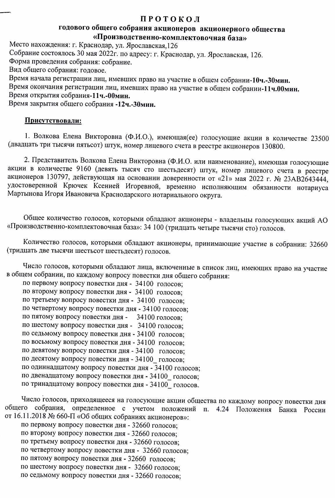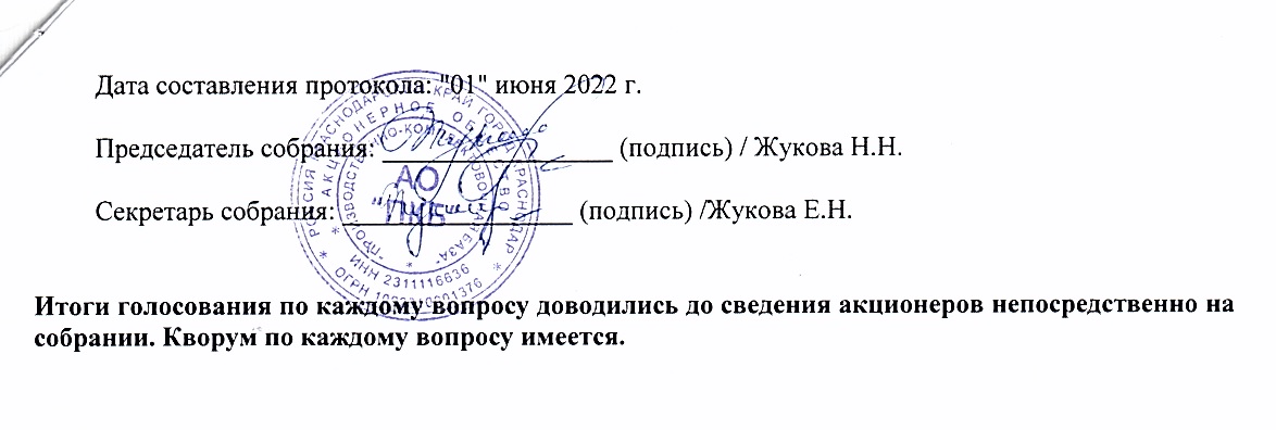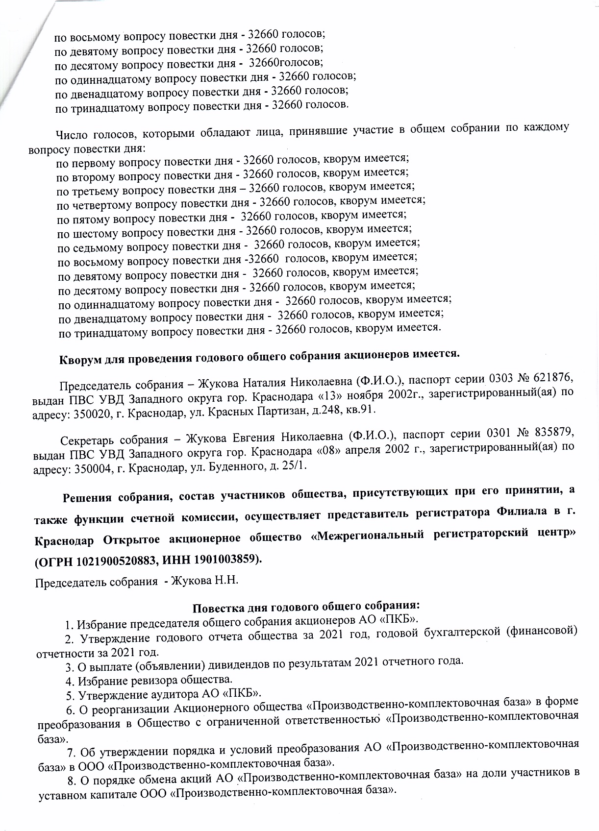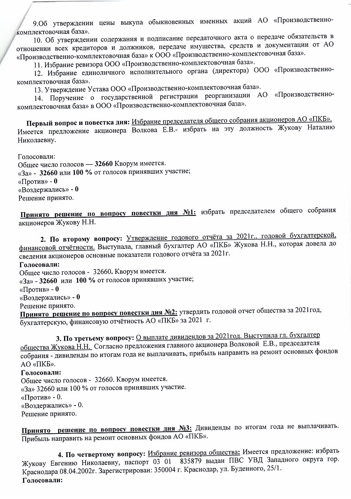 Протокол годового общего собрания акционеров АО «ПКБ» от 30.05.2022 г.