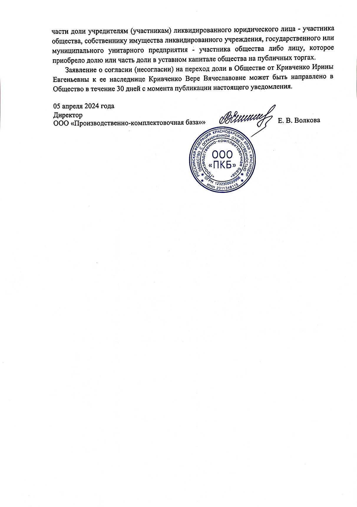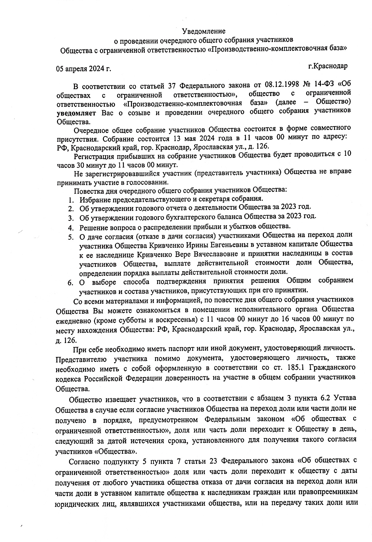 Уведомление о проведении очередного общего собрания участников Общества с ограниченной ответственностью «Производственно-комплектовочная база»