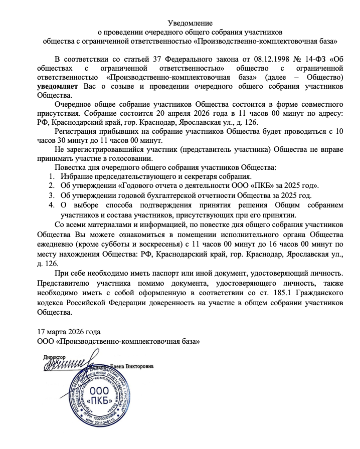 20 апреля 2026 г. Состоится внеочередное общее собрание участников ООО «Производственно-комплектовочная база»
