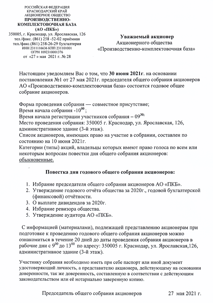 30 июня 2021 г. Состоится общее годовое собрание акционеров!